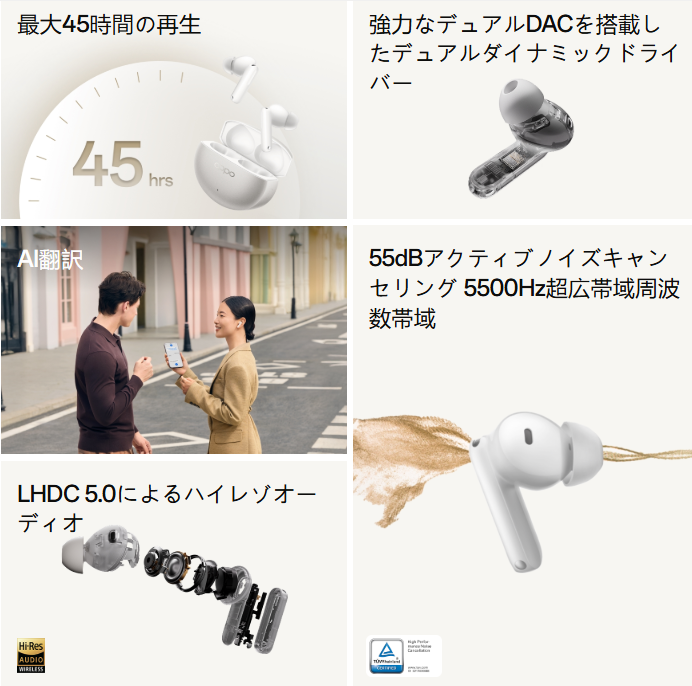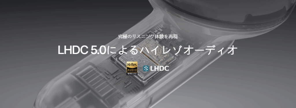 さらに、ワイヤレス伝送のコーデックは、一般的なAAC、SBCに加え、LHDC 5.0にも対応。LHDC 5.0は、ハイレゾ音源をワイヤレスでも高音質のまま伝送できる規格です。対応するスマートフォン(Oppo製スマホなど)と組み合わせれば、CDを超える情報量のサウンド体験が期待できます。