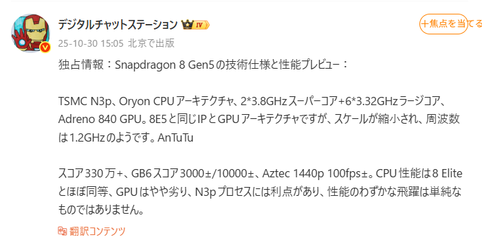「OnePlus 15」をはじめ、各社から「Snapdragon 8 Elite Gen 5」搭載のハイエンドスマートフォンが続々と発表され、その圧倒的な性能に市場が沸いています。しかし、その影で、同じQualcomm Summitで発表されたはずの「Snapdragon 8 Gen 5」(無印)の情報が、なぜか今頃になってリークとして浮上してきました。