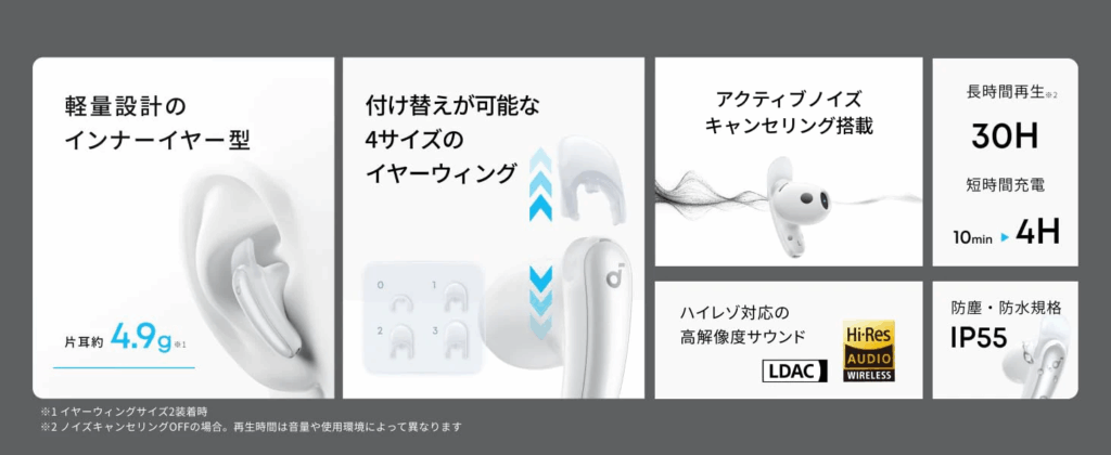 - 最大の特徴: Soundcore初・インナーイヤー型アクティブノイズキャンセリング