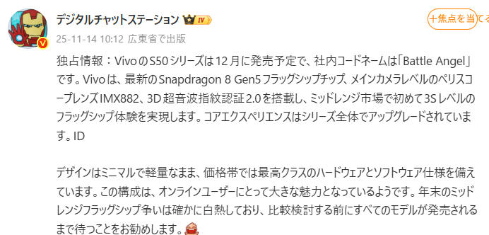 リークによれば、Vivo S50シリーズは12月に発売される見込みとのこと。これは、まさに年末のボーナス商戦、クリスマス商戦を直撃するタイミングです。