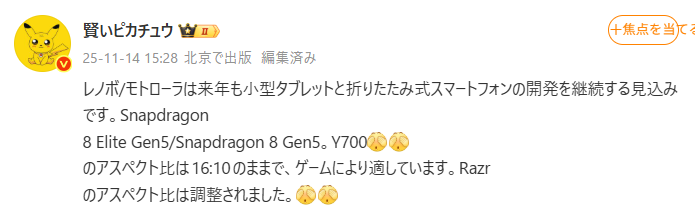 しかし、Motorolaの「本気」は性能だけにとどまりません。Smart Pikachu氏によると、MotorolaはRazr 70世代で「アスペクト比(画面の縦横比)」を調整したとのこと。