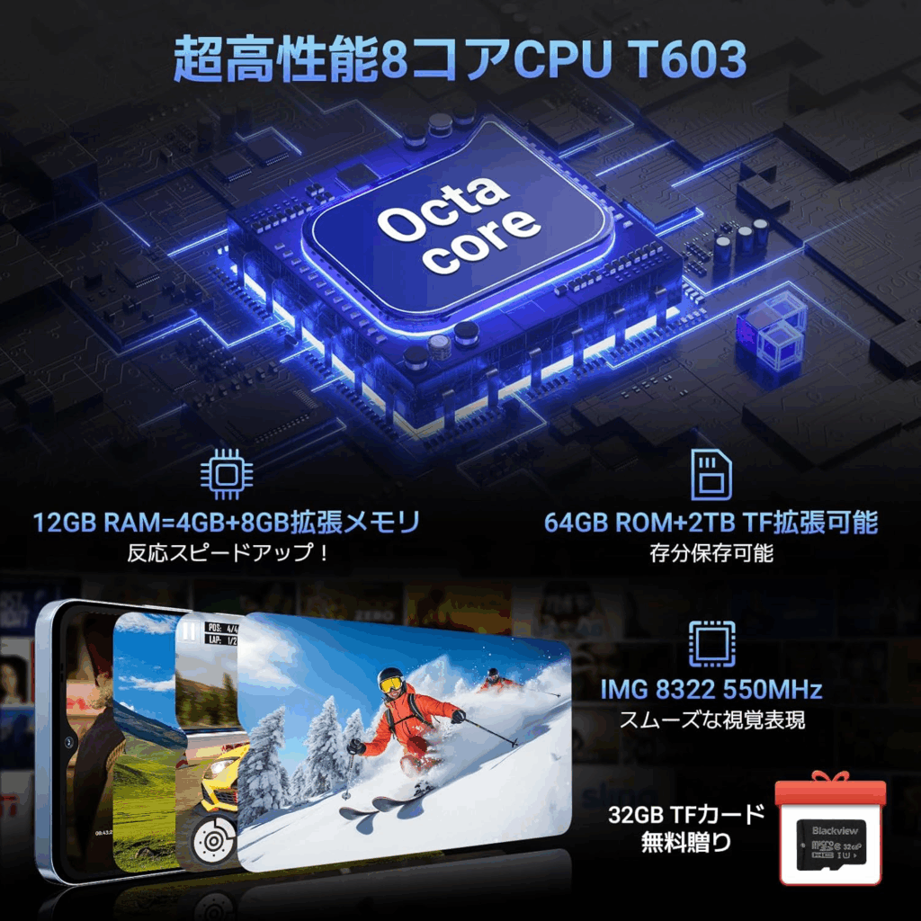 CPUは「Unisoc T603」というオクタコア(8コア)を搭載。そして注目すべきはRAM(作業机の広さ)です。なんと12GB(仮想拡張含む)。