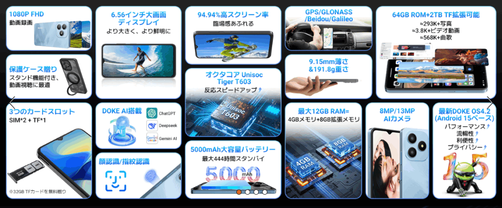 驚くべきは、この価格で搭載してきた「中身」=スペックです。まずは、このスペック表をご覧ください。これは1万円台のスマホのスペック表ではありません。数年前であれば、ミドルレンジ(3〜4万円クラス)と呼ばれていたレベルのものです。