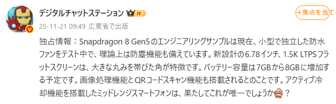 なんと、Snapdragon 8 Gen 5を搭載しつつ、防水・防塵のアクティブ冷却ファンを内蔵しているというのです。さらにバッテリーは驚異の8000mAh。