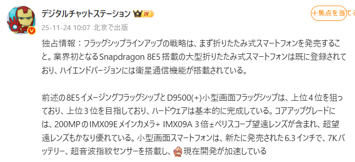 もちろん、パフォーマンス面での不安は残りますが、近年のDimensityシリーズの評価はうなぎ登りです。もしSnapdragon 8 Eliteと同等の処理能力を持ちながら、省電力性能で上回るようなことがあれば、7000mAhのバッテリーと相まって「数日間充電不要」という異次元のスタミナを実現する可能性があります。
