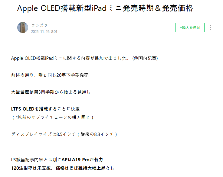 もしiPhone 17(無印)が120Hzやそれに近い技術を採用した場合、iPad mini 8は表示品質の滑らかさにおいて、スタンダードなiPhoneにさえ劣る可能性があります。