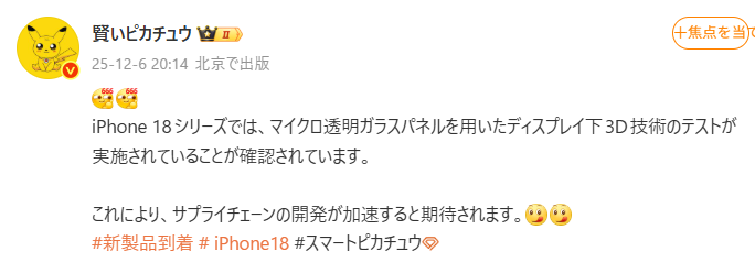 ところが最近になって、風向きがまた変わりました。Weiboで活動する著名なリーカー、その名も「スマートピカチュウ」氏(名前の可愛さはさておき、実績のある人物です)が、非常に興味深い情報を投下したのです。彼によると、現在のiPhone 18のプロトタイプでは、Face ID用のセンサー類が新しいガラスパネルの下に配置され、目に見えなくなっているというのです。