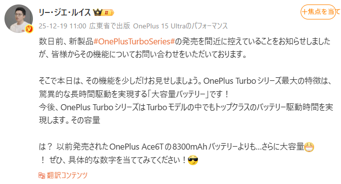 これまで、OnePlus Ace 6Tが搭載していた8,300mAhという容量でも「化け物級」と言われてきました。しかし、OnePlusのルイス・リー社長は、Turboシリーズがその記録をさらに塗り替えることを明言しました。