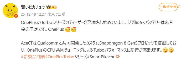 現在、OnePlus Turboシリーズは2026年1月の中国発売が有力視されています。