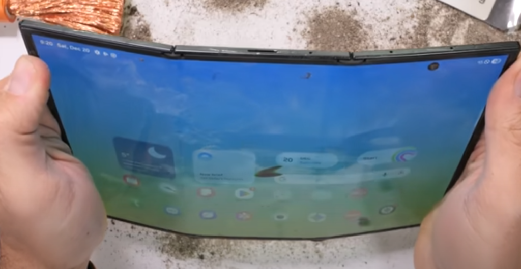 そして、運命の曲げ試験。通常の折りたたみ方向とは逆に力を込めた瞬間、TriFoldはあっけなく折れ曲がりました。2つのヒンジと超薄型筐体は、外部からの圧力に対してあまりにも無防備だったのです。