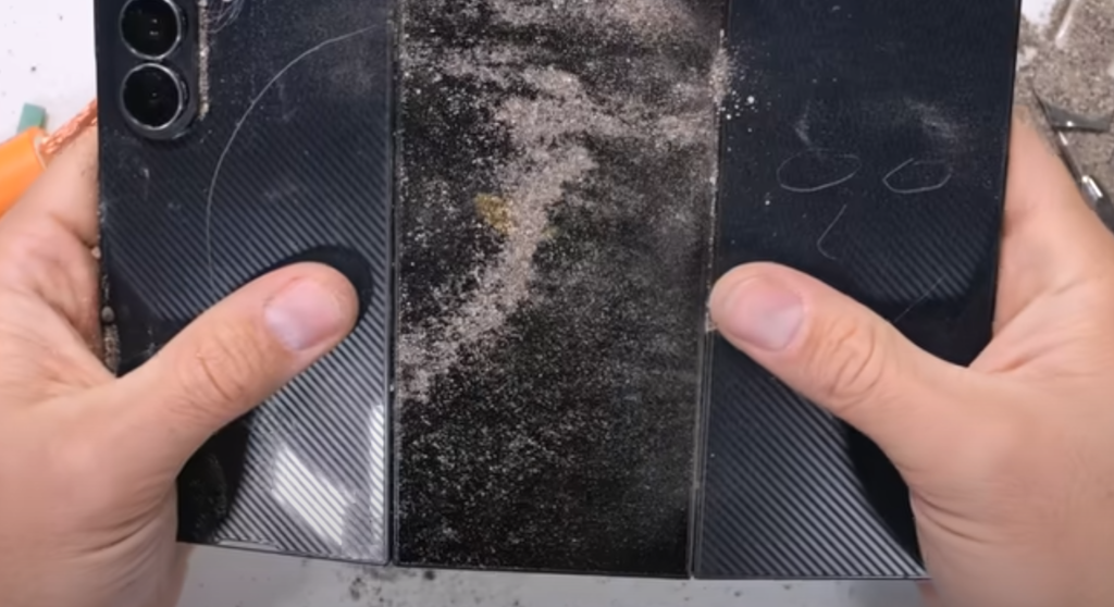金属やガラスに比べて傷がつきやすく、ザック氏の鋭いカッターの前では、まるでバターのように簡単に傷跡が刻まれていきました。この時点で、多くの視聴者が「あ、これはいつものSamsungじゃない」と直感したはずです。