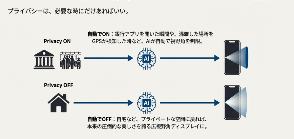 この機能の凄さは、物理的なフィルターを必要としない点にあります。アニメーションでは、見る角度によってディスプレイの輝度や見え方が劇的に変化する様子が描かれています。これまでの液晶をただ暗くする技術とは一線を画す、ディスプレイそのものの制御による進化が期待されています。