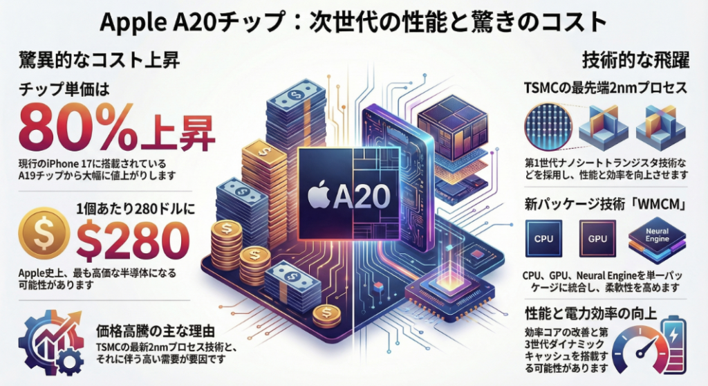 台湾からの新たな報道によると次世代iPhoneの心臓部となる「A20」チップ。その製造コストが、現行のiPhone 17に搭載されているA19チップから80%以上も跳ね上がり、1個あたり約280ドル(現在のレートで4万円強)に達するという驚きの予測が出てきました。