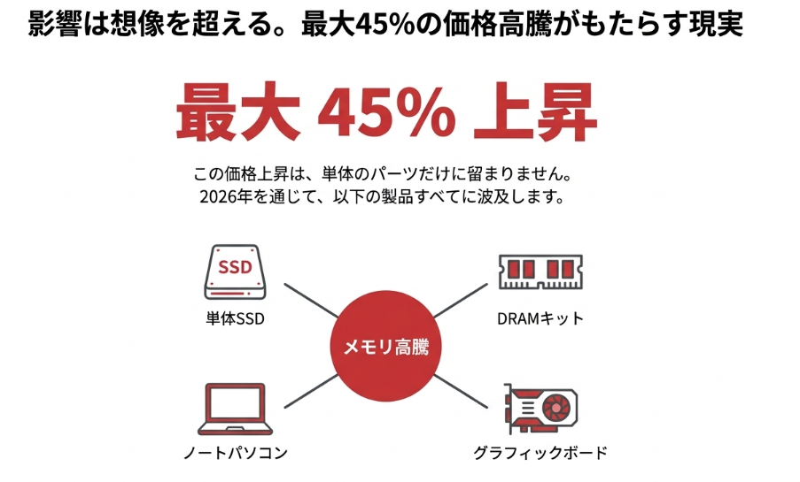 2026年を通じて、メモリ価格は最大で45%も上昇するという予測もあり、もはや「少し待てば安くなる」という期待は捨て去るべき局面に来ています。