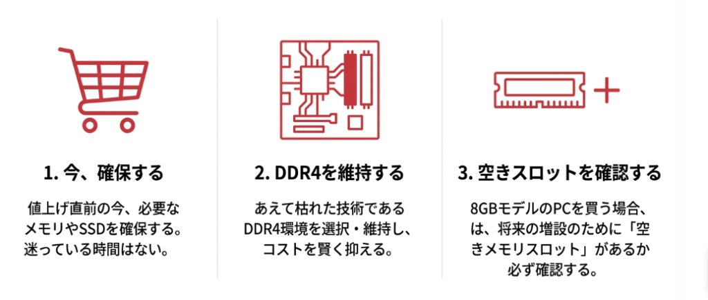 しかし、過去の例を見ても、主要メーカーが動いた後の市場は一気に「売り手市場」へと変貌します。もしあなたが今、メモリの増設やSSDの換装を迷っているなら、迷っている時間はもう残されていないかもしれません。