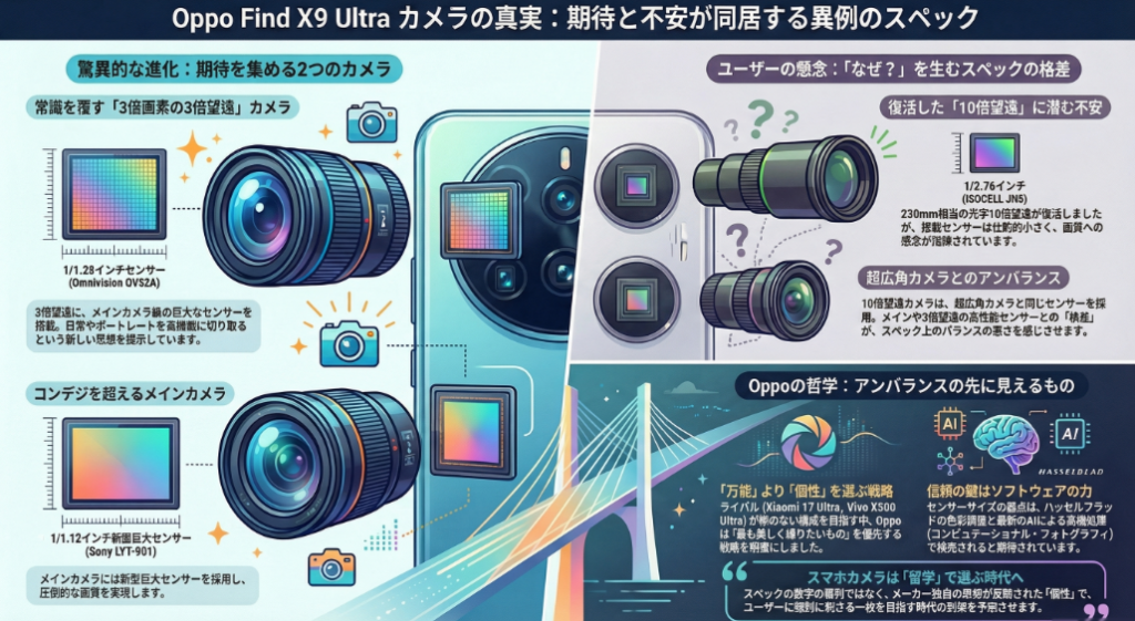 カメラ好きなら誰しも、スペック表のバランスの悪さに敏感です。メインと3倍望遠に最高級の素材を使いながら、超広角と10倍望遠には一段落ちるセンサーを配置する。この「格差」は、一見するとコストカットのようにも見えます。