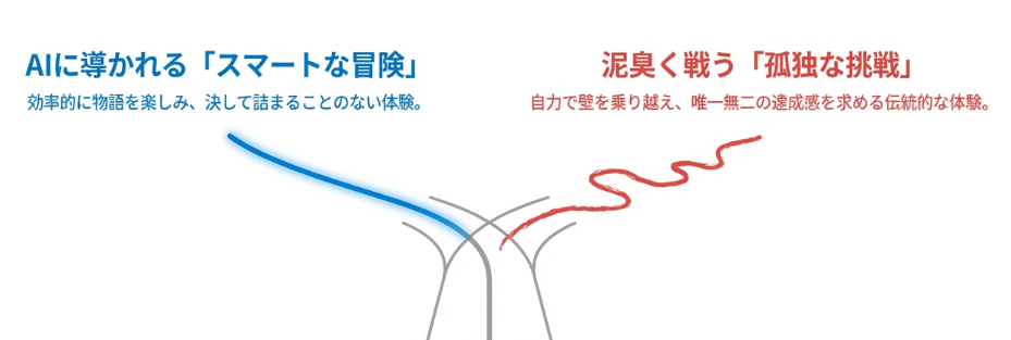 大切なのは、その機能を使うか使わないかを選択する自由が、私たちプレイヤーの手に委ねられていることです。AIに導かれる「スマートな冒険」を選ぶのか、それとも泥臭く死に物狂いで戦う「孤独な挑戦」を貫くのか。