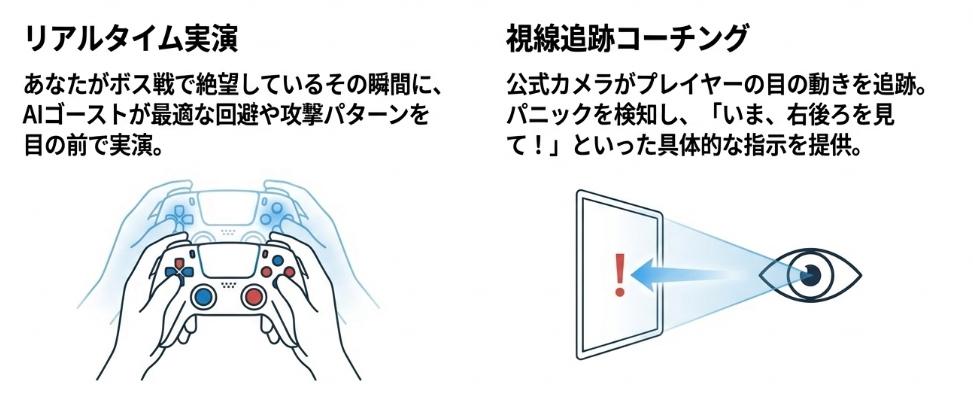 あなたがエルデンリングのような死にゲーで、あるボスの理不尽な連続攻撃に絶望しているとき、AIゴーストがひらりと現れます。それは単なる残像ではなく、最新のデータセンターから抽出された「正解の動き」を、あなたの目の前で、あなたのプレイ状況に合わせて実演してくれるのです。