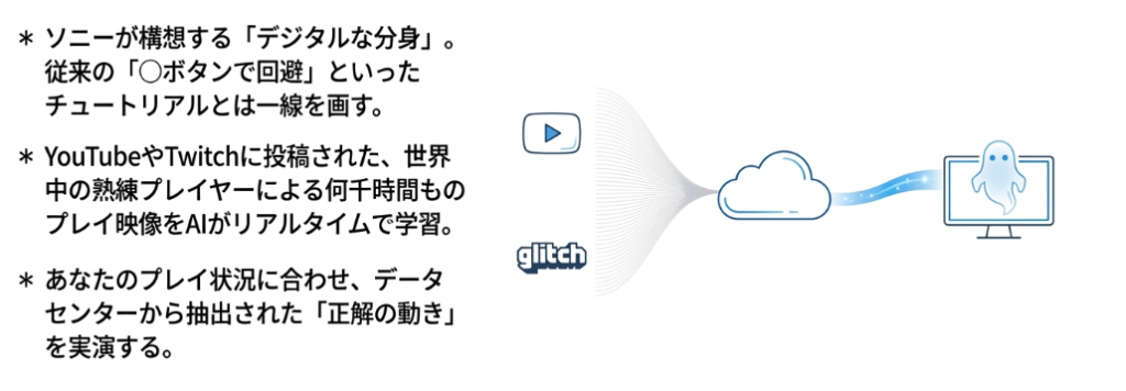 しかし、この特許が実現しようとしているのは、世界中の熟練プレイヤーがYouTubeやTwitchにアップした膨大なプレイ映像をリアルタイムで学習した「デジタルな分身」です。