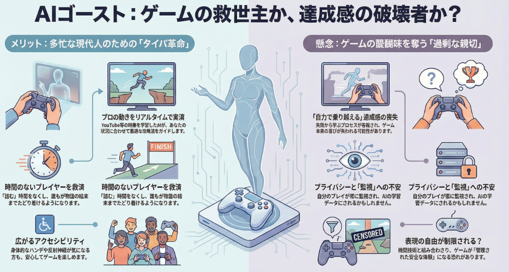 ゲームの醍醐味とは、失敗を繰り返し、パターンを覚え、ようやく勝利を掴み取るプロセスにあります。もし、AIが「こう動けば勝てますよ」と手取り足取り教えてくれ、なんなら操作まで代行してくれるとしたら。それは果たして「自分がプレイした」と言えるのでしょうか。