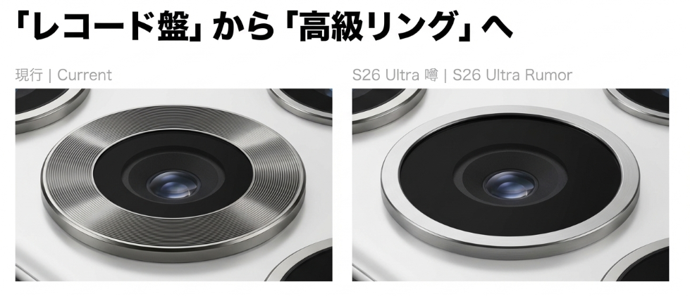 最新の情報によると、S26 Ultraではこのリングが刷新され、よりミニマルで高級感のある金属製リングへと進化を遂げるとのこと。そして、その質感が「iPhone 17 Pro Maxにそっくりだ」というのです。