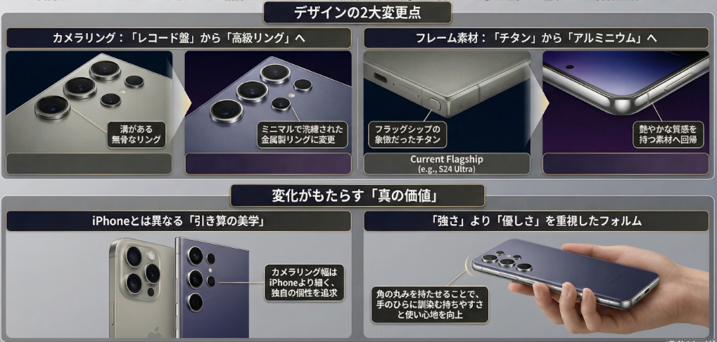 かつてのGalaxy S23 Ultraのような、あの艶やかなアルミニウムの質感が戻ってくるのだとしたら、それは「退化」ではなく、むしろ「洗練された原点回帰」と呼べるかもしれません。