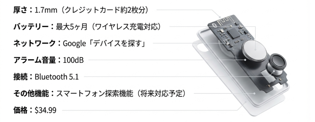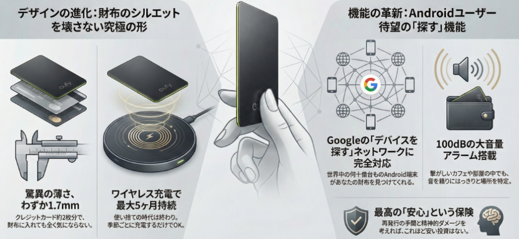 従来のカード型トラッカーは、どうしても「少し厚みのあるカード」という存在感がありました。せっかくミニマリスト向けの薄い財布を使っていても、トラッカーのせいで財布が膨らんでしまうのは本末転倒ですよね。