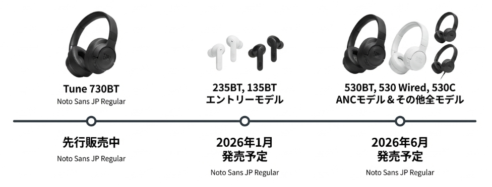 実は、ミッドレンジの730BTは、すでに日本で先行販売が始まっています。 その他のモデルについては、エントリーモデルが2026年1月、上位モデルを含む残りは6月発売予定です。