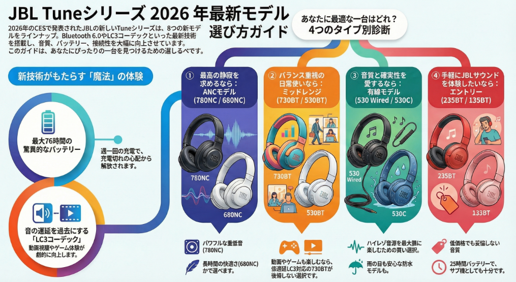 CES 2026で発表されたJBLの新しいTuneシリーズ。 正直、多すぎて「どれを買えばいいの?」と迷っていませんか?
