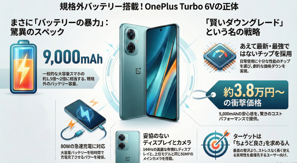 スマホ選びの基準が「ベンチマークスコア」から「何日間生き残れるか」に変わる。 OnePlus Turbo 6Vは、そんな新しい時代の幕開けを予感させる1台です。
