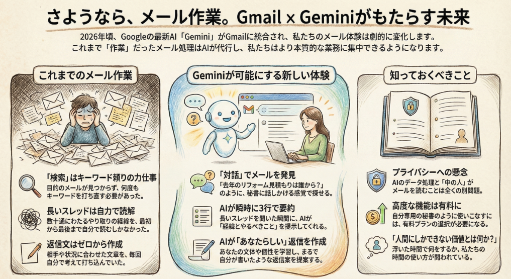 便利さを享受しながらも、ツールに振り回されない。2026年のGmailとの付き合い方は、そんな「賢い使い分け」が鍵になりそうです。
