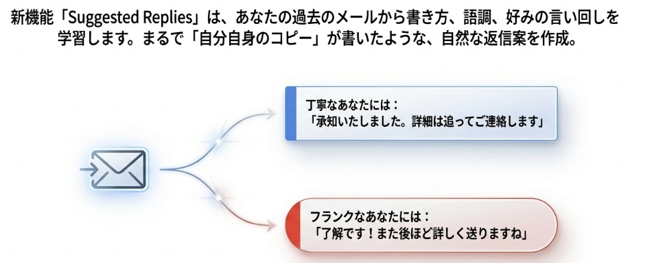 ライティングツールも劇的に進化しています。新機能の「Suggested Replies」は、単なる定型文の提示ではありません。これまでのあなたのメールの書き方、語調、好みの言い回しを学習し、まるで「自分自身のコピー」が書いたような返信案を作成します。