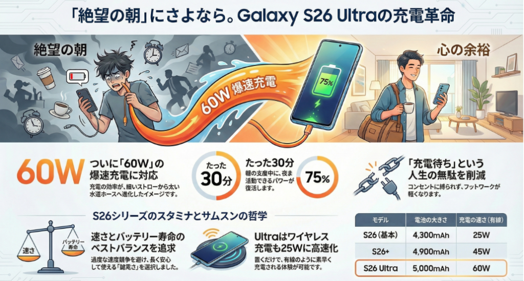 | S26 Ultra | 5,000mAh | 60W | シリーズ最強の爆速充電 |