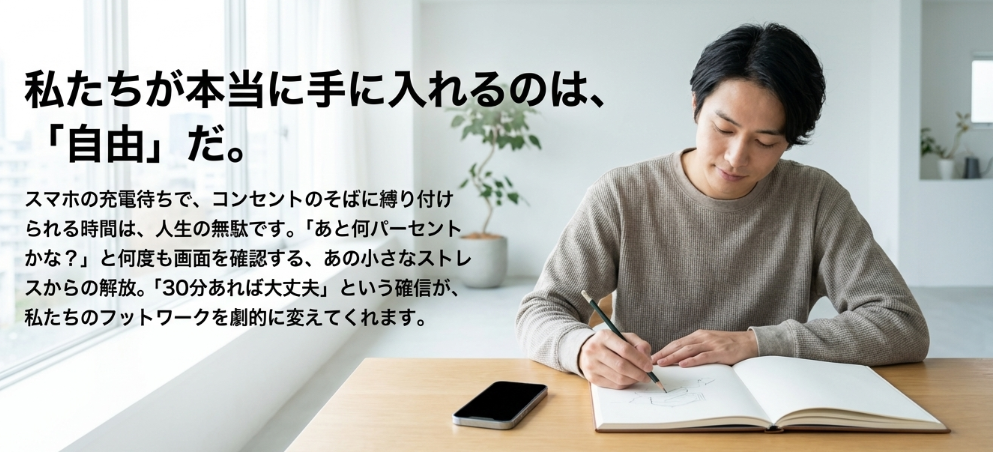 スマホの充電待ちで、コンセントのそばに縛り付けられる時間は、人生の無駄です。