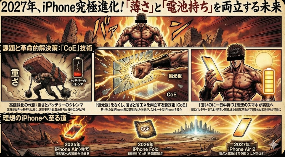 2025年に最初のiPhone Airが出ると噂されていますが、2027年の「iPhone Air 2」では、このCoE技術によって、薄いのに電池が持つという、私たちが長年夢見てきたスマホが完成する可能性があります。