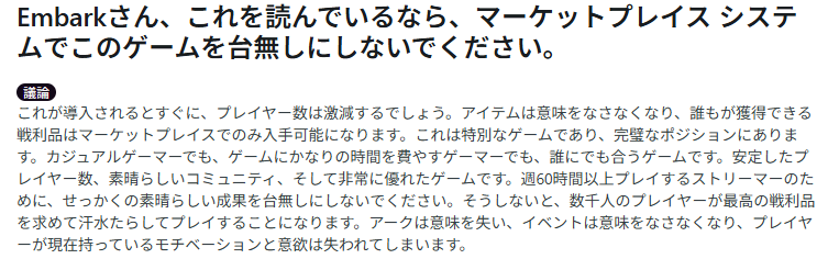 1月6日、Redditに投稿された「Embarkさん、マーケットプレイスでこのゲームを台無しにしないで!」というスレッドには、わずか数日で750件を超える悲痛なコメントが寄せられました。