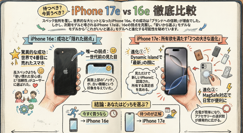 ここで気になるのは「今すぐ16eを買うべきか、それとも17eを待つべきか」という問題です。