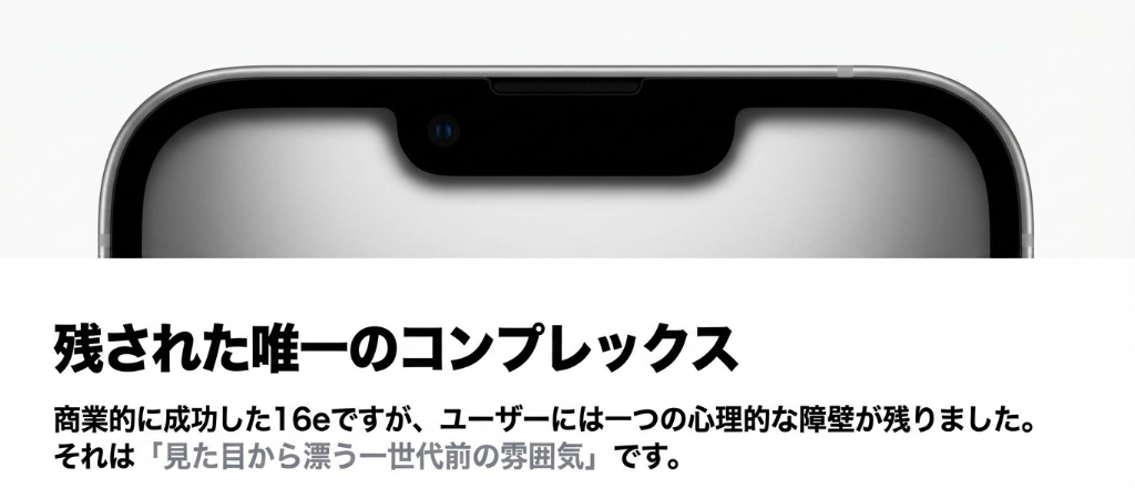 iPhone 16eは成功しましたが、唯一とも言える弱点がありました。 それが「見た目から漂う一世代前の雰囲気」です。 具体的には、画面上部の「ノッチ」と「MagSafe非対応(と言われていた点)」です。