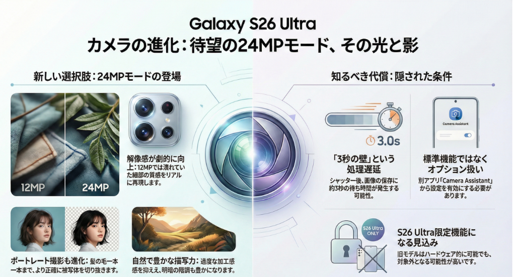 つまり、理屈の上では今のモデルでも2400万画素モードを動かせるはずなのです。しかし、Samsungはこの機能をS26世代限定の目玉として囲い込む方針のようです。
