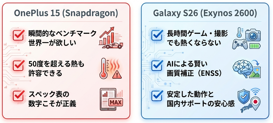 OnePlus 15は確かに魅力的で、その瞬発力は2026年でもトップクラスでしょう。しかし、日本国内でのサポート体制や、リセールバリュー、そして何より「手のひらで暴走しない安心感」を天秤にかけたとき、Galaxyというブランドが持つ重みは無視できません。