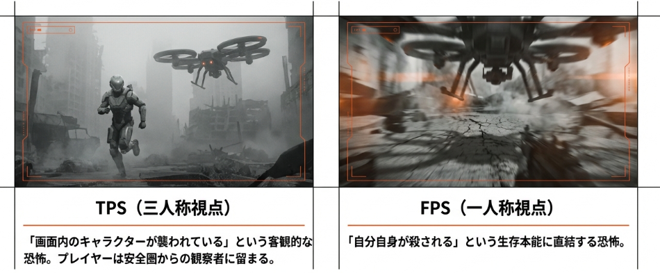 TPSでは「画面内のキャラが襲われている」という客観的な恐怖で済んでいたものが、FPSになった途端、それは「自分が殺される」という生存本能に直結する恐怖へと変貌する。