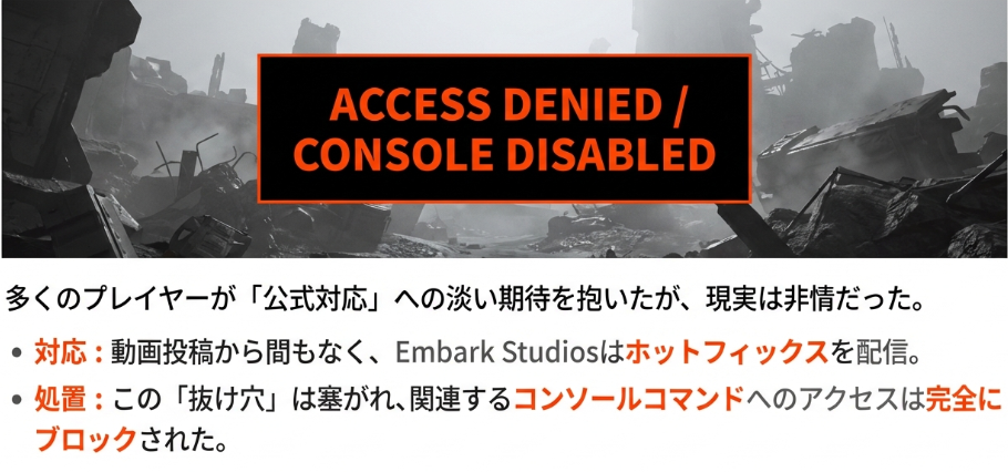 この「抜け穴」を塞ぎ、関連するコンソールコマンドへのアクセスを完全にブロックしたのである。