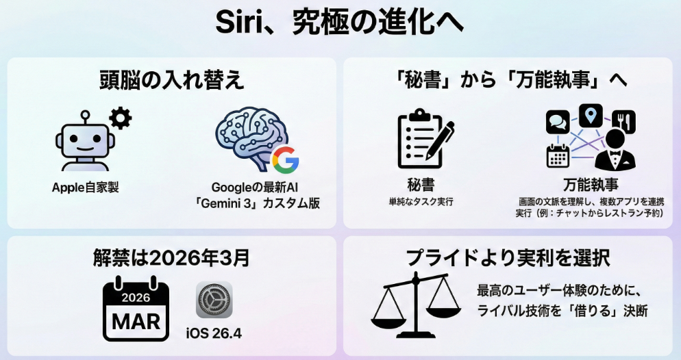 そのもどかしさが、2026年3月、ついに過去のものになろうとしている。 これは単なるアップデートではなく、Appleの「プライド」を捨てた究極の生存戦略なのだ。