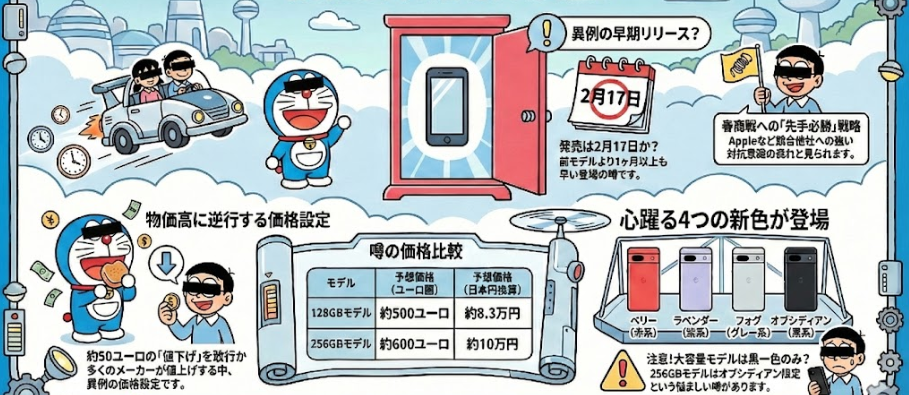 海外の著名なリーカー、Arsène Lupin氏が共有した最新情報によると、Pixel 10aはユーロ圏で2月17日に発売される可能性がある。昨年のPixel 9aが3月発売だったことを考えると、1ヶ月以上も早いお披露目となる。