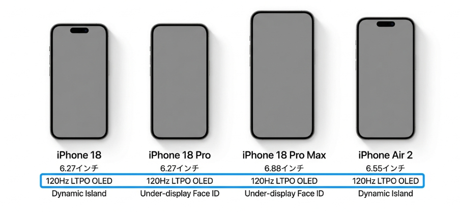 | iPhone Air 2 | 6.55インチ | 120Hz LTPO OLED | ダイナミックアイランド |
