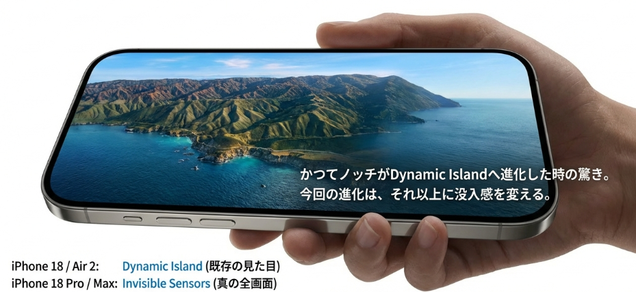 「ディスプレイの下に切り欠きがある」という表現がリークされているが、これはダイナミックアイランドが劇的に小型化することを意味している。Face IDのセンサー類を画面の裏側に埋め込み、表面からは見えない、あるいは極限まで目立たない形に再設計される。