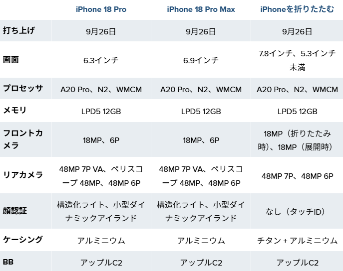 これら3機種が今年9月の主役となる。一方で、標準モデルのiPhone 18や廉価版のiPhone 18e、さらには「Air 2」といったモデルは2027年までお預け。
