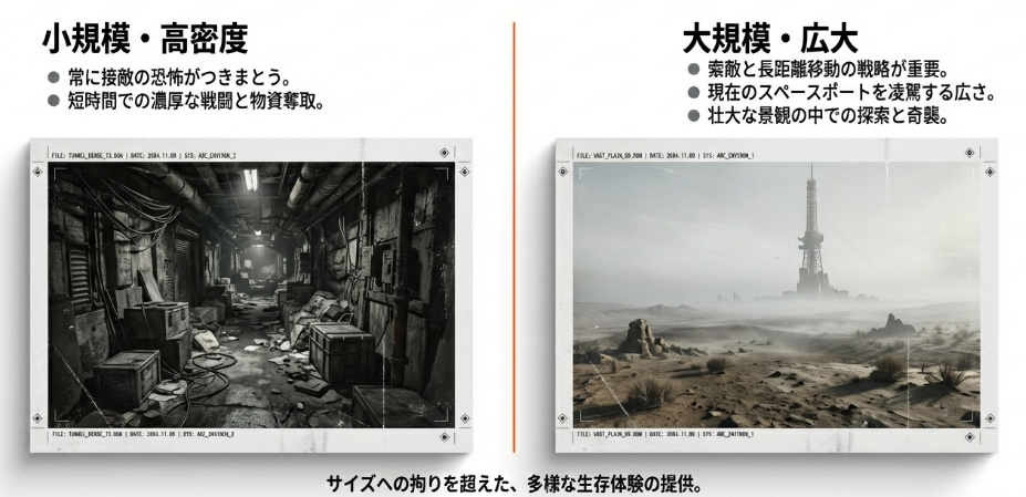 | 小規模・高密度 | 常に接敵の恐怖がつきまとう | 短時間での濃厚な戦闘と物資奪取 |