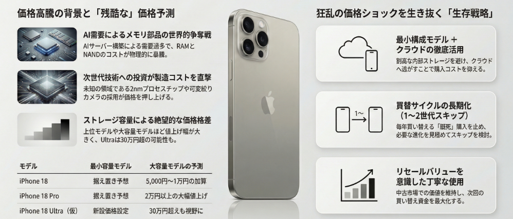 結論から言おう。iPhone 18は、これまでの価格体系を破壊する「史上最も高価なデバイス」になる可能性が極めて高い。かつては誰もが手に入れられた魔法の板が、いよいよ選ばれし者だけの贅沢品へと変貌を遂げようとしているのだ。