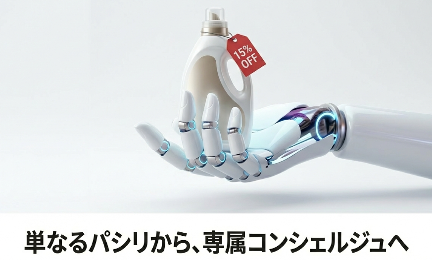 例えば、過去の注文サイクルから「そろそろ洗剤が切れる頃だけど、今なら定期便で15%オフになるよ」と提案してくれたり、複数の候補から「あなたの好みに合うのはこれだ」と絞り込んでくれるような、コンシェルジュとしての付加価値だ。